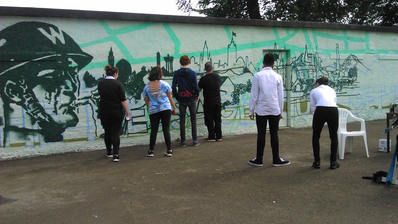When the Council announced it was seeking bids to its local events fund in January, FoRP thought a mural like this would reflect the building’s uniquely well-documented history. A grant was secured of £3,000 for a mural on the Armoury wall(s), to be produced by ZAP Graffitti of Liverpool. The artist, Kieran Gorman, did the FoRP mural on the north Armoury wall with young people back in 2012. He is from Livingston and lived in Roseburn before moving south. Kieran worked in August 2019 with both old and young on this project (with the accent being on those aged 50+). The design was based on the survey results (see above).